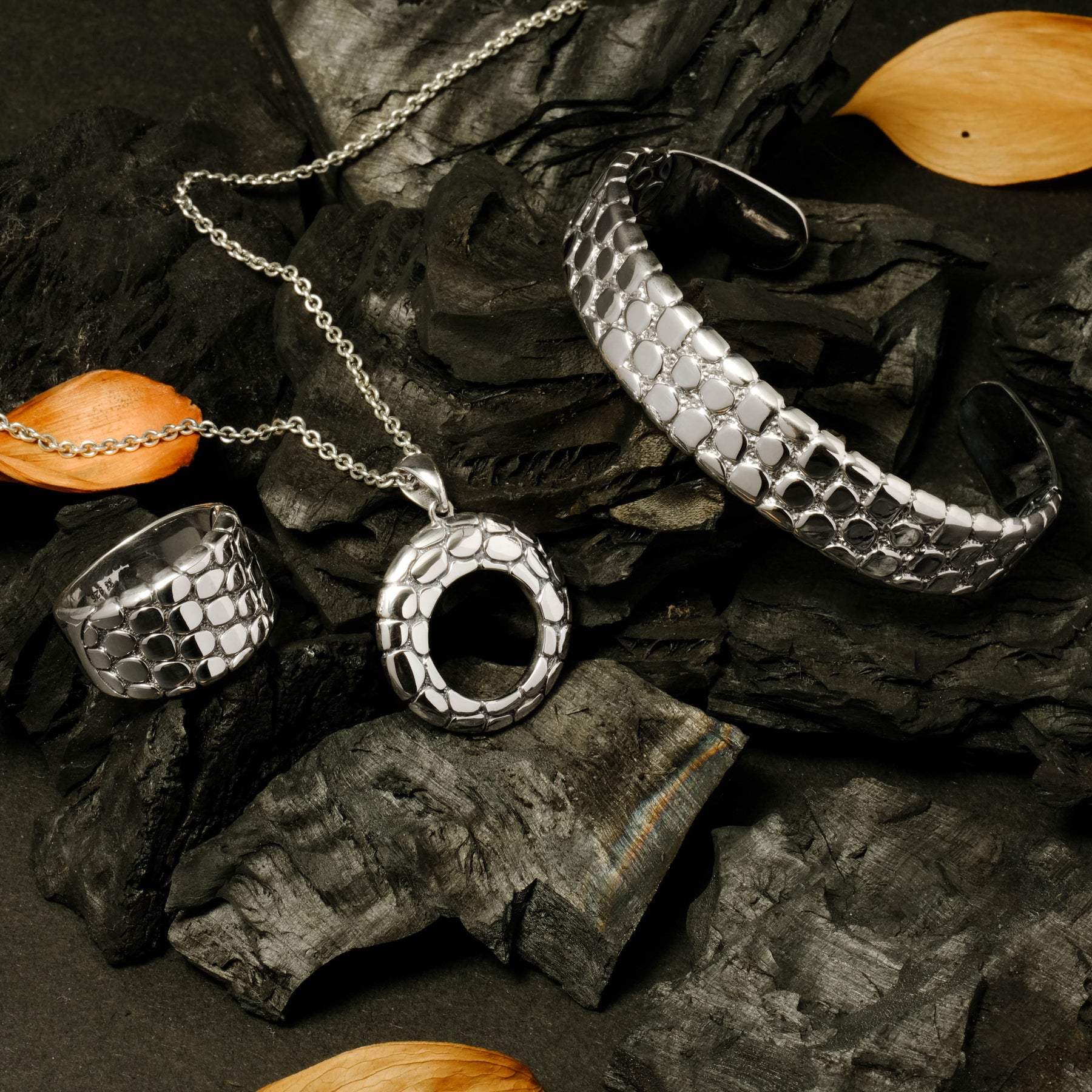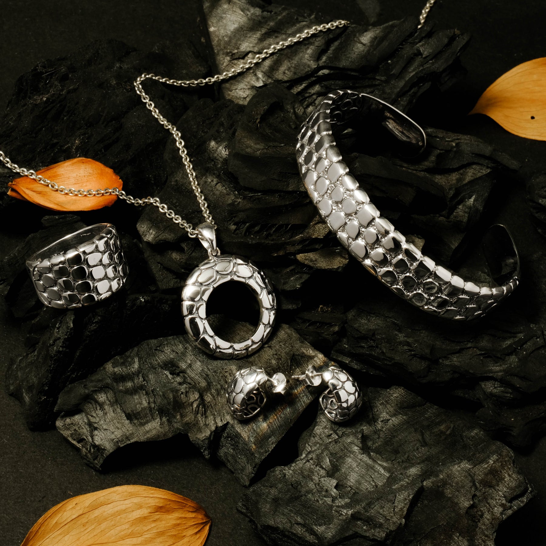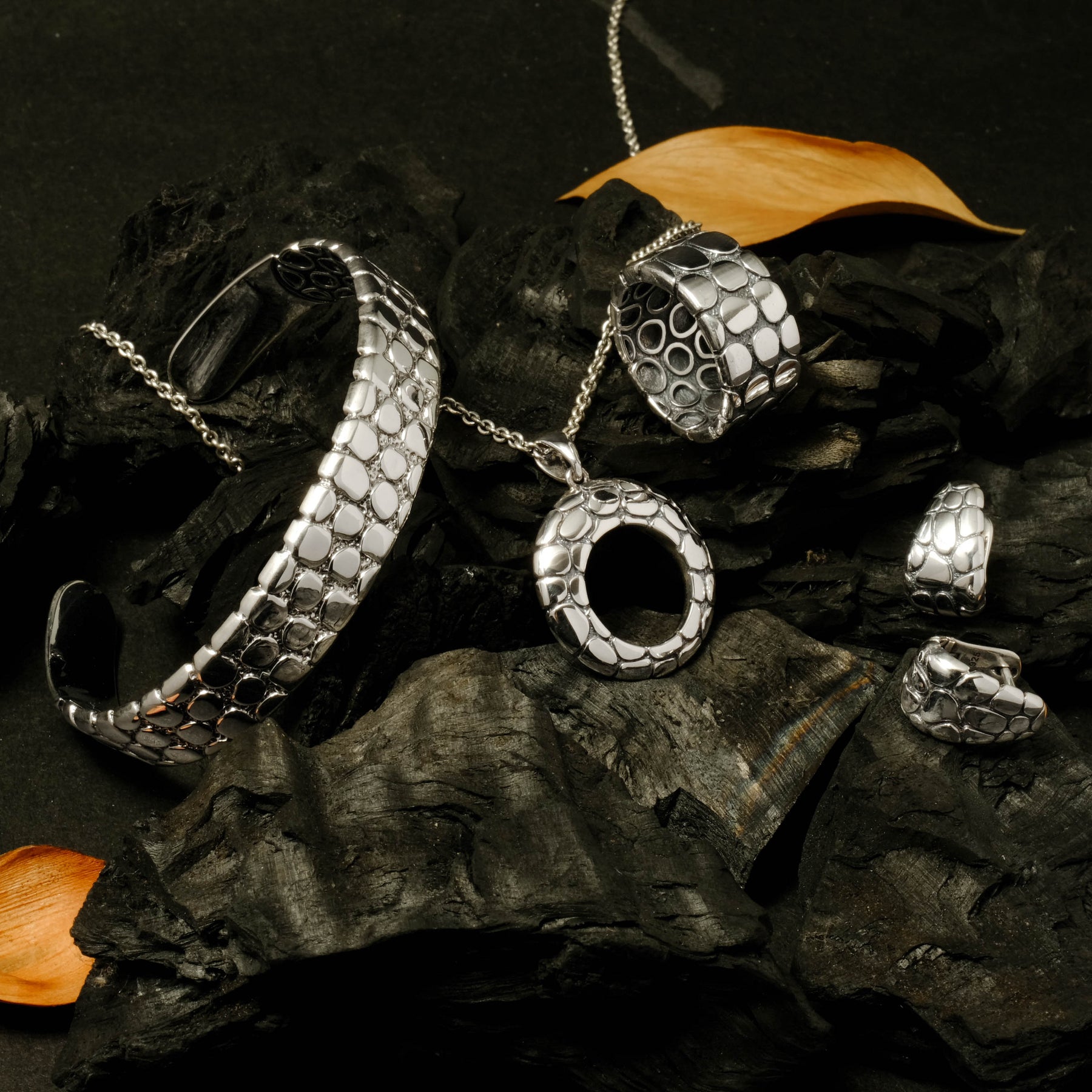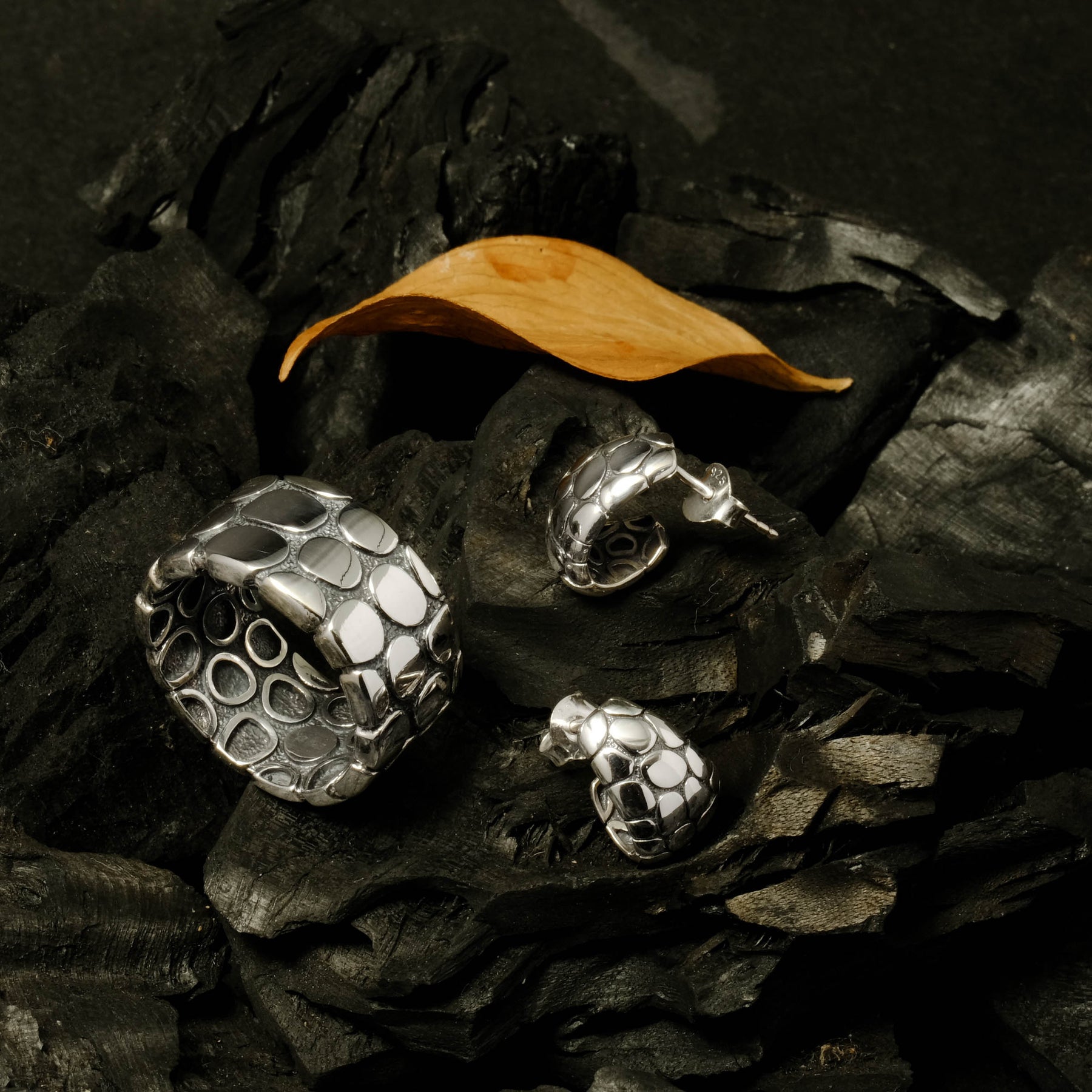 The oxidized silver finish adds an artistic contrast, accentuating the natural details of every piece. With its minimalist yet captivating character, the Pebble Collection is available in bangles, pendants, earrings, and rings — perfect for everyday wear or as a statement piece for special moments.