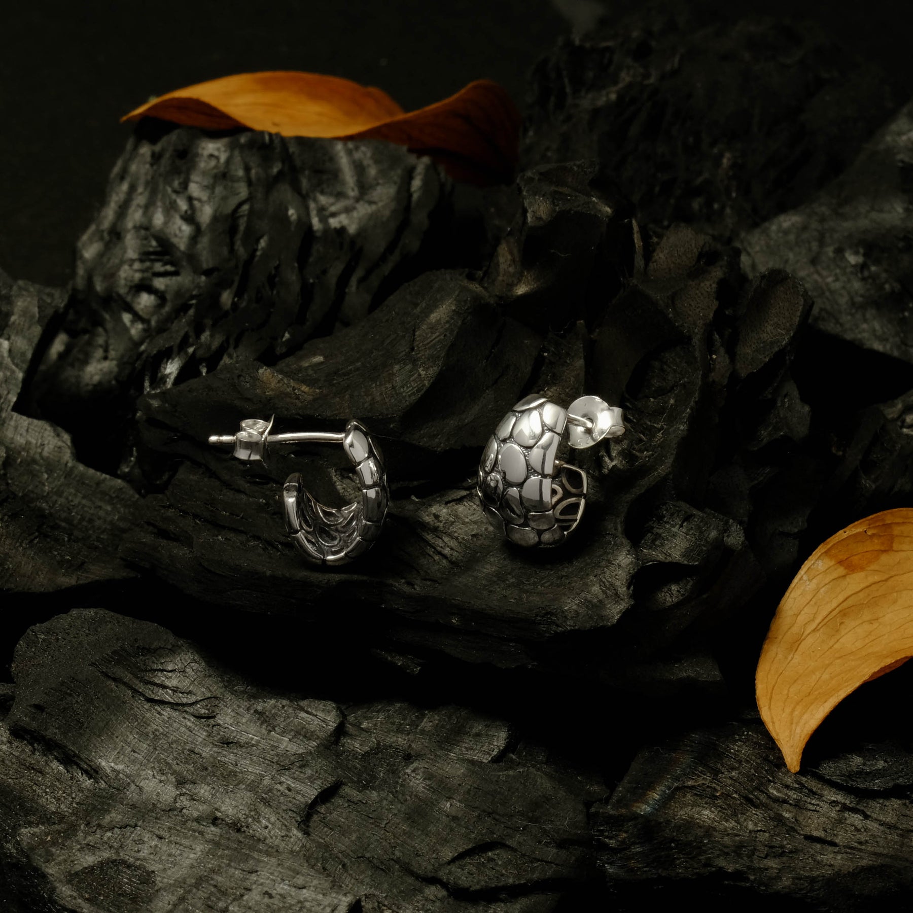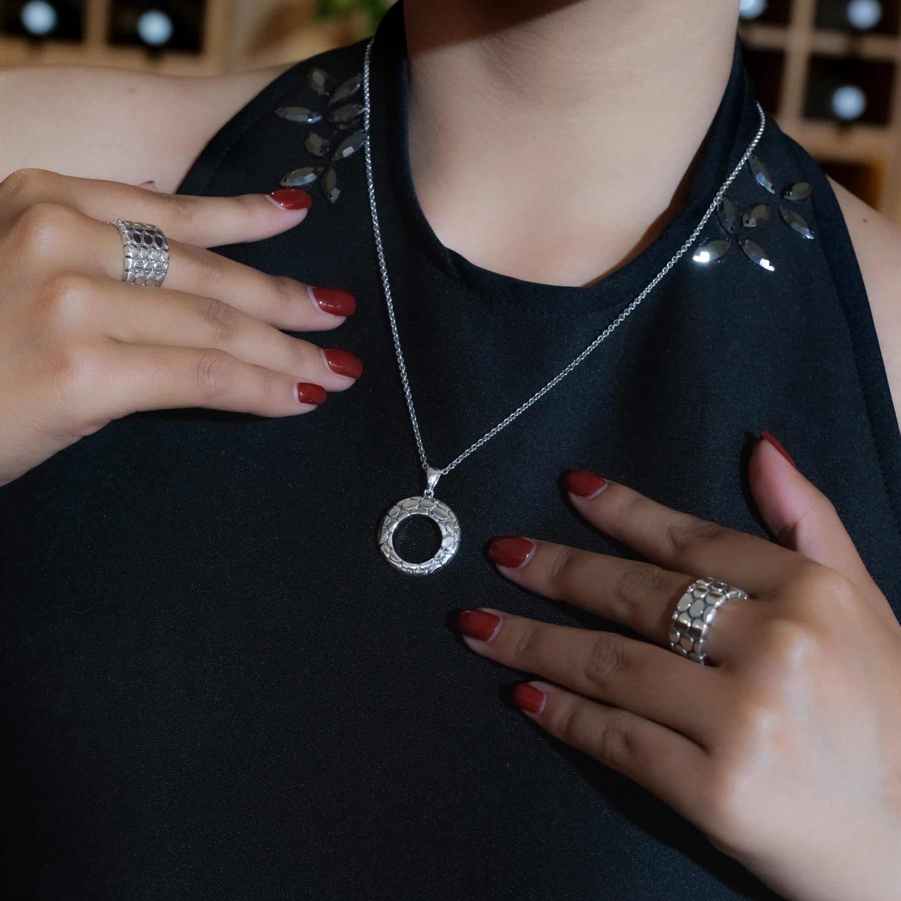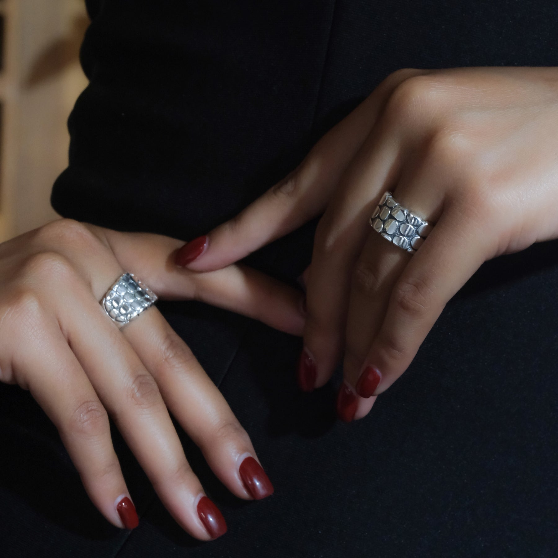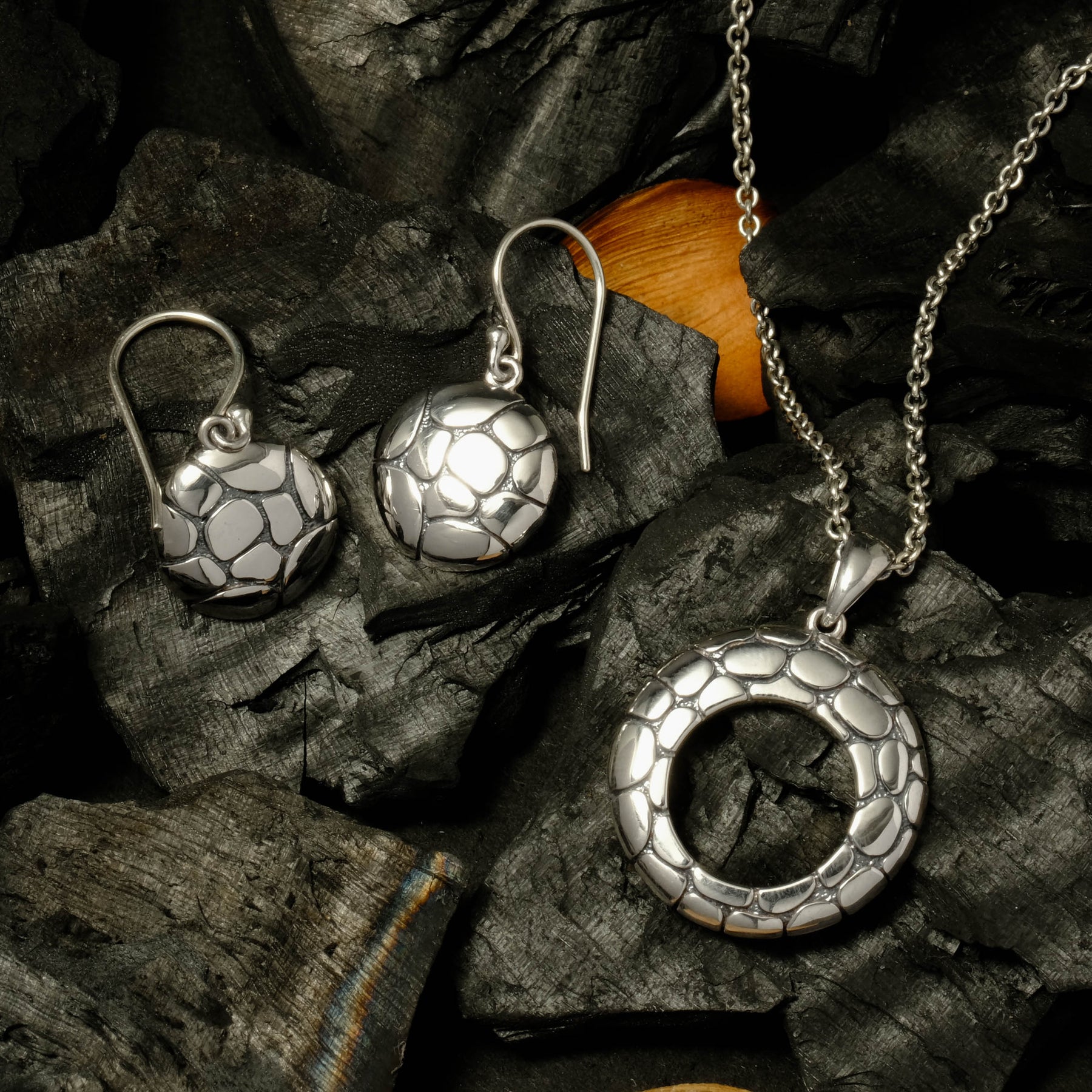 The oxidized silver finish adds an artistic contrast, accentuating the natural details of every piece. With its minimalist yet captivating character, the Pebble Collection is available in bangles, pendants, earrings, and rings — perfect for everyday wear or as a statement piece for special moments.